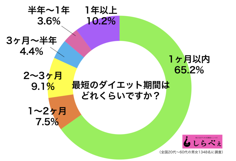 しらべぇ編集部は全国の20代〜60代の男女1,348名を対象に「ダイエット」について調査したところ、65.2%の人が「1ヶ月以内でダイエットをやめた」と回答している。