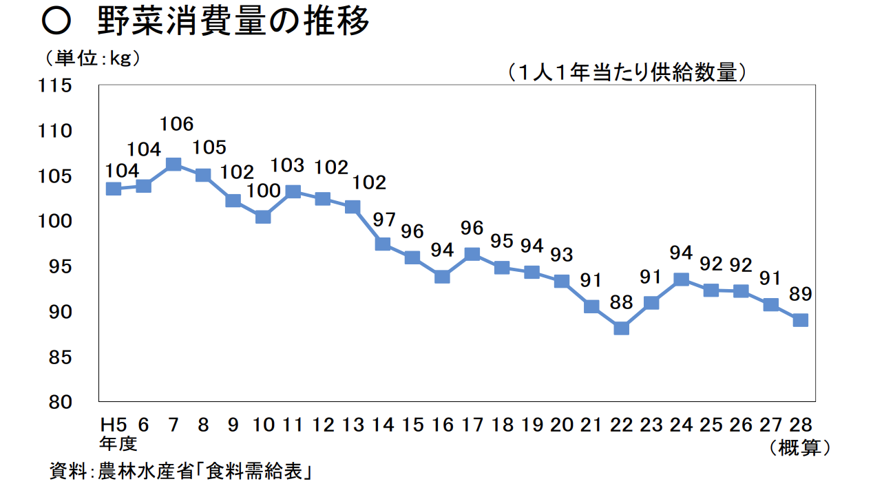 野菜農家が減少するには、収入の低さや、農家の高齢化、後継者の不在などさまざまな理由があるでしょうが、まず最初に押さえておかないといけないのは、野菜の消費量に変化が起こっていないかです。